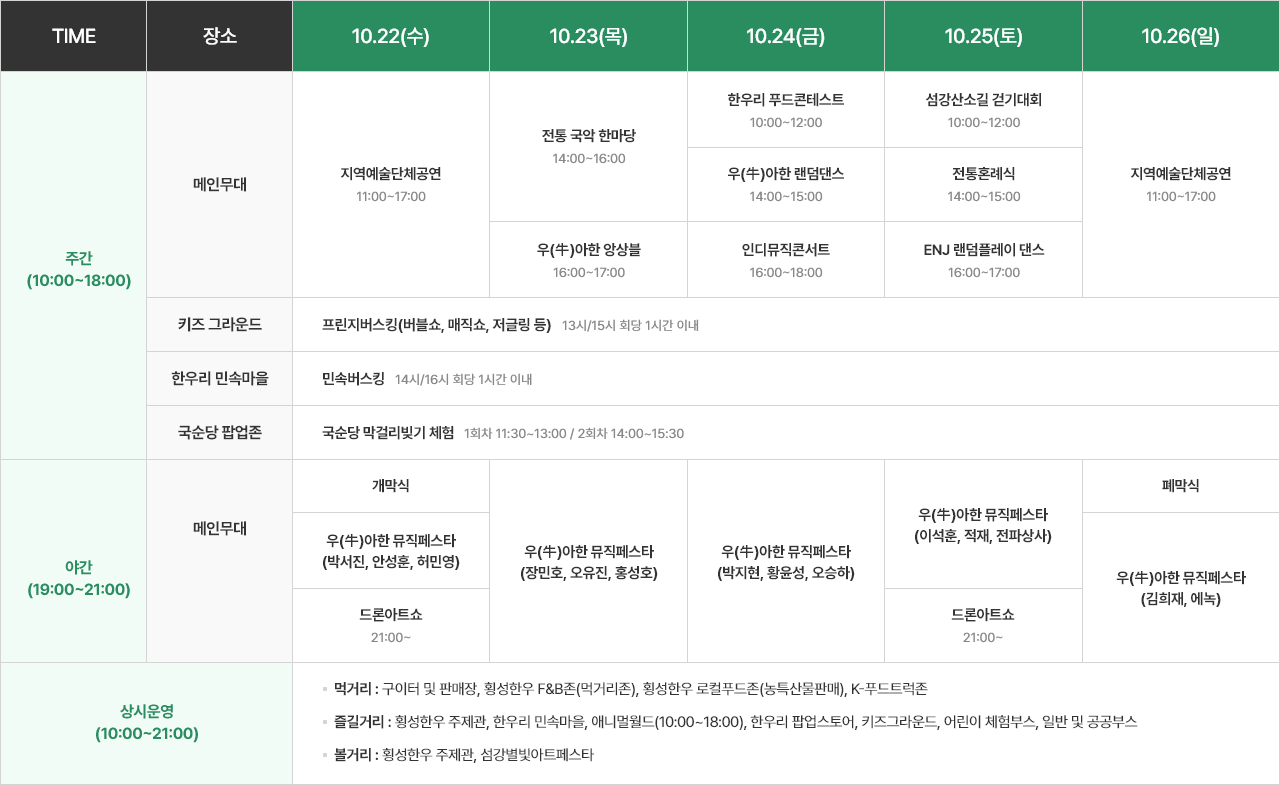 횡성한우축제 콘서트 라인업 10.22 (수) 10.23 (목) 10.24 (금) 10.25 (토) 10.26 (일) 박서진 10.22 (수) 안성훈 10.22 (수) 장민호 10.23 (목) 오유진 10.23 (목) 박지현 10.24 (금) 황윤성 10.24 (금) 이석훈 10.25 (토) 적